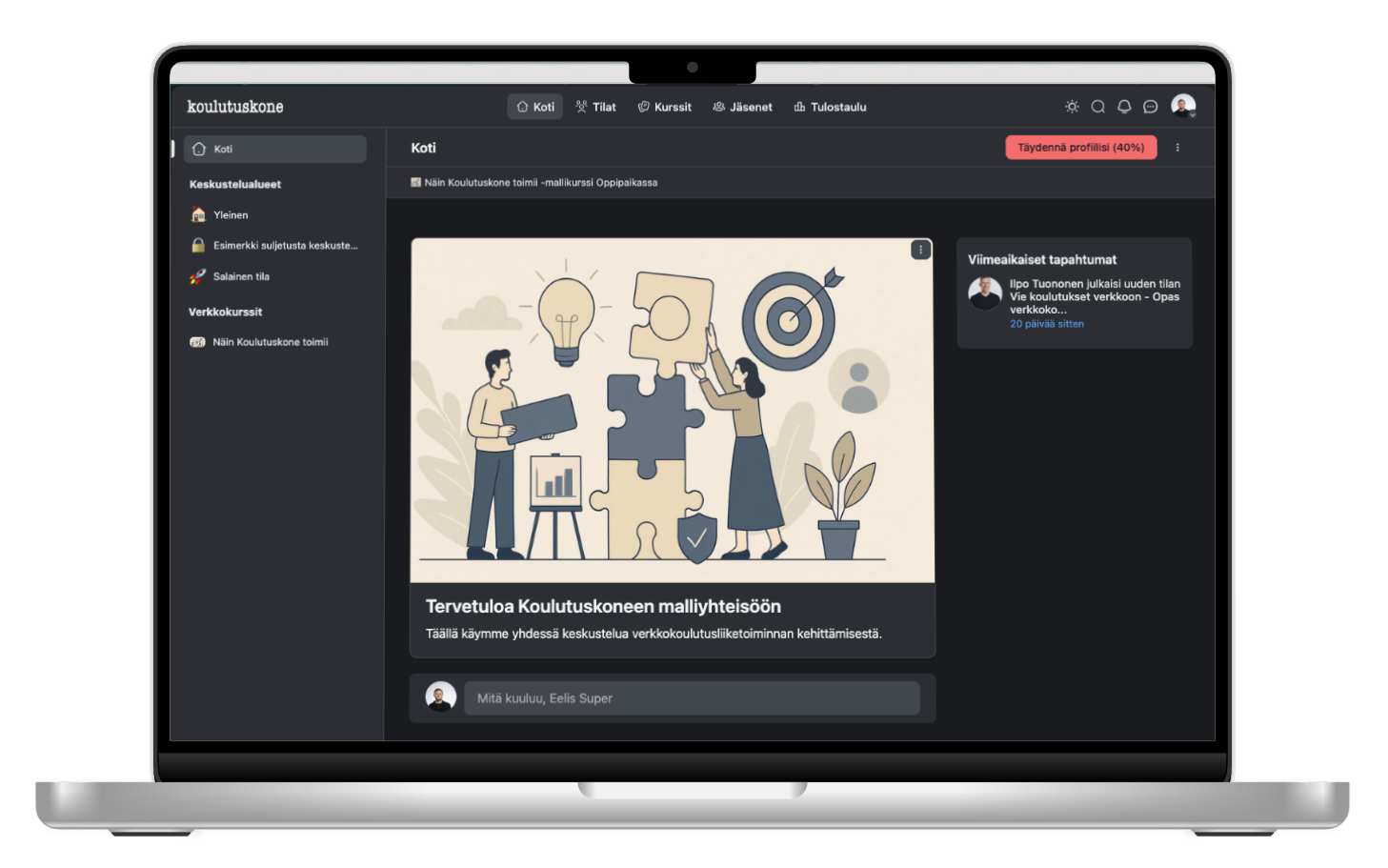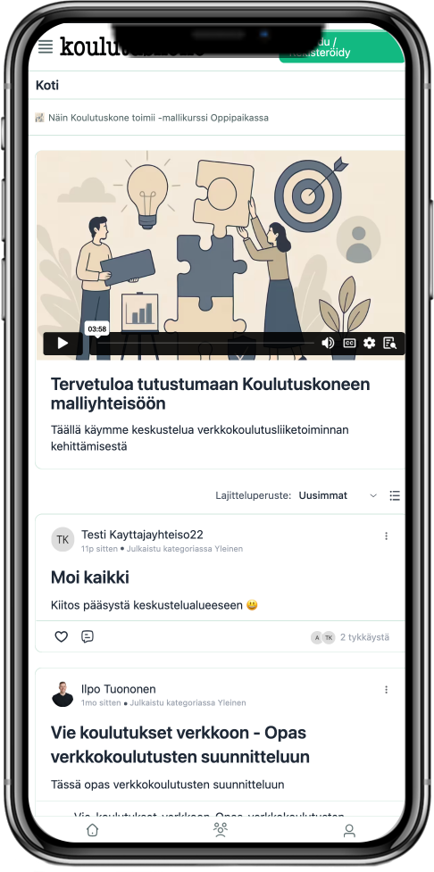 Sivusto. Verkkokurssit. Verkkokauppa. Yhteisö. CRM ja asiakasviestintä. Automaatiot. Koulutuskone on modulaarinen alusta, joka kasvaa liiketoimintasi mukana.
